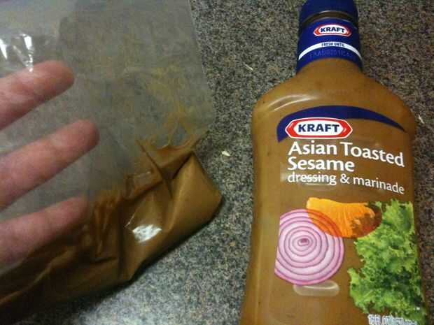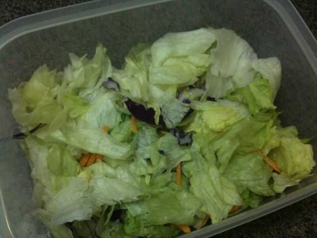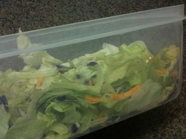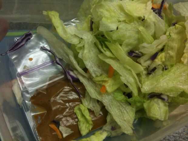 Por lo tanto, para una base, poner alguna ensalada en la parte inferior, con una bolsa de ziploc de vestir. Debe ir bien con la izquierda sobre el ojo de la costilla. Plus... Creo que es cool para llamarlo una ensalada secreto porque nadie sabe su allí! Hasta que comen su manera a ella.