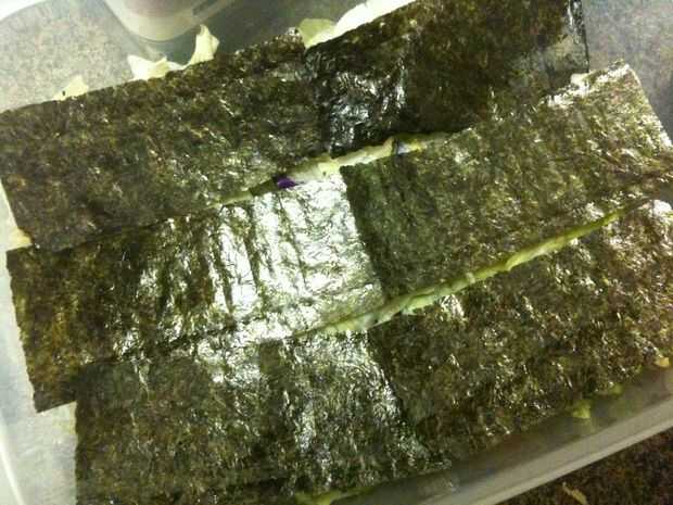 Después de la ensalada, puse una fina capa de algas/nori, con sabor a teriyaki. Funciona bien porque es un poco pegajosa.