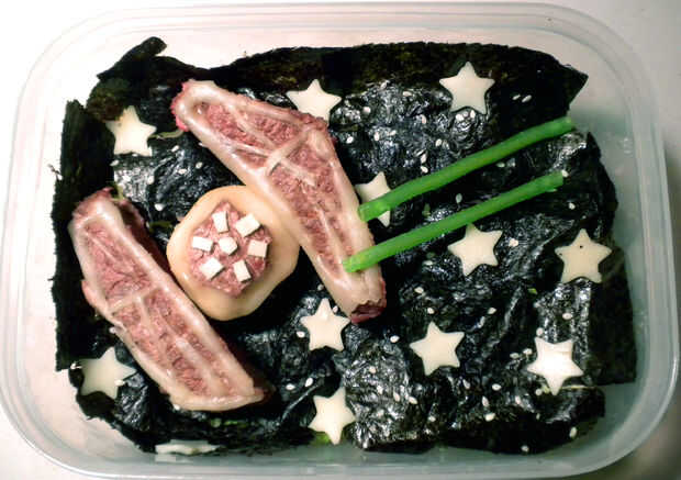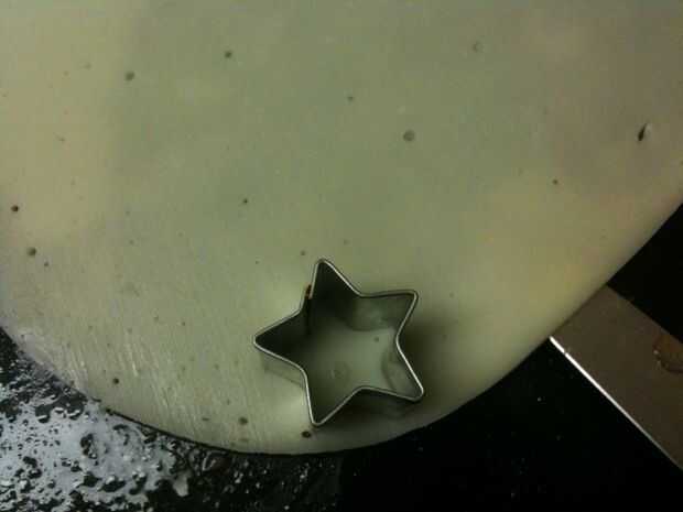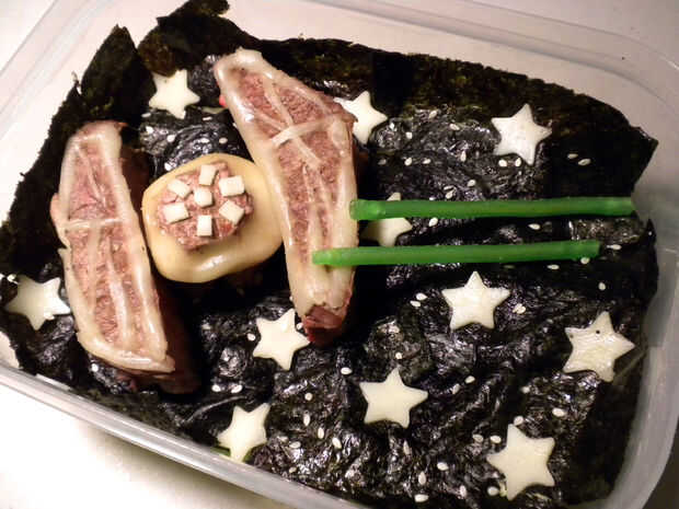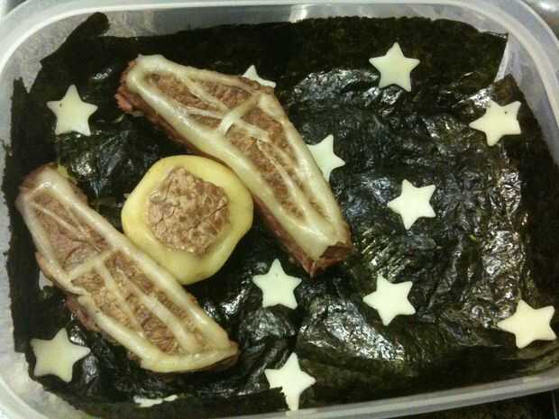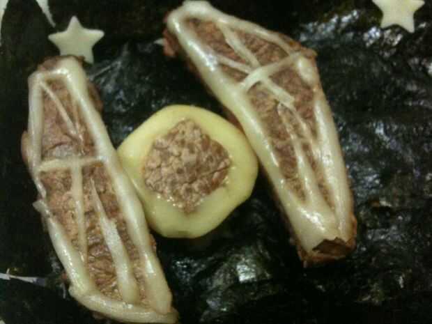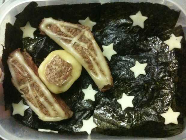 Está bien, situar su Tie Fighter de alguna manera ritualista de Star Wars... Sólo adiviné. A continuación os ponemos algunas estrellas alrededor de su nave. Utilicé un cortador de galletas pequeño, una rodaja de queso provolone y espaciadas muy bien. Las estrellas pequeñas, manchas, sólo espolvorear unas semillas de sésamo en.