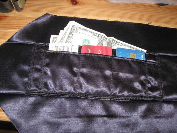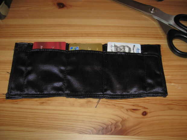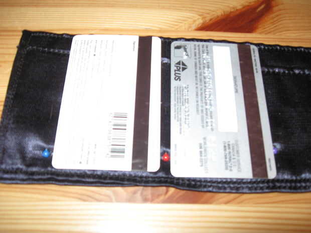 Posición 3 tarjetas en la parte superior el más pequeño rectángulo y coser a lo largo de los bordes de la tarjeta para hacer bolsillos de tarjeta.
