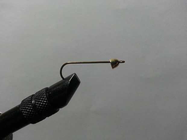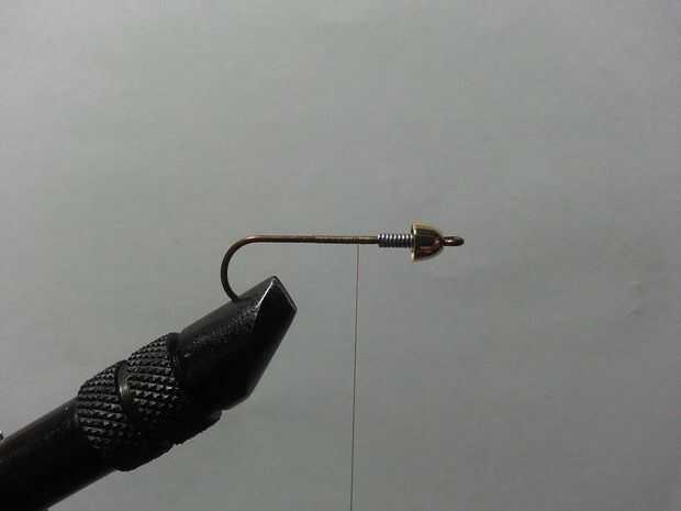 Para añadir peso a la mosca, añadir aproximadamente 15 vueltas de alambre de plomo a la caña del gancho y levantarse dentro del grano.