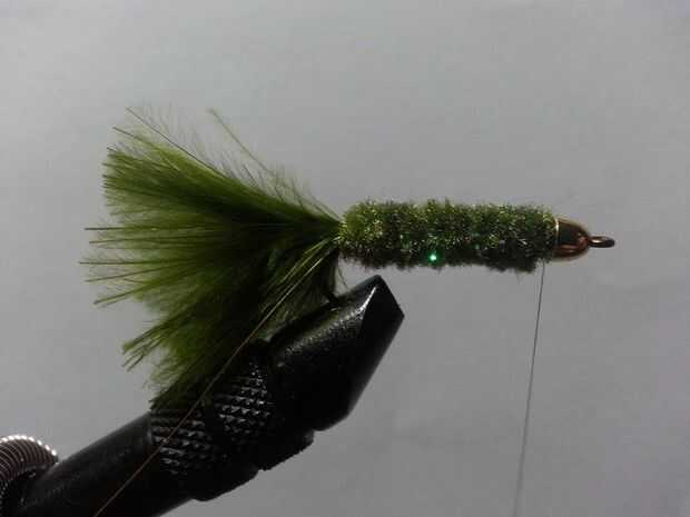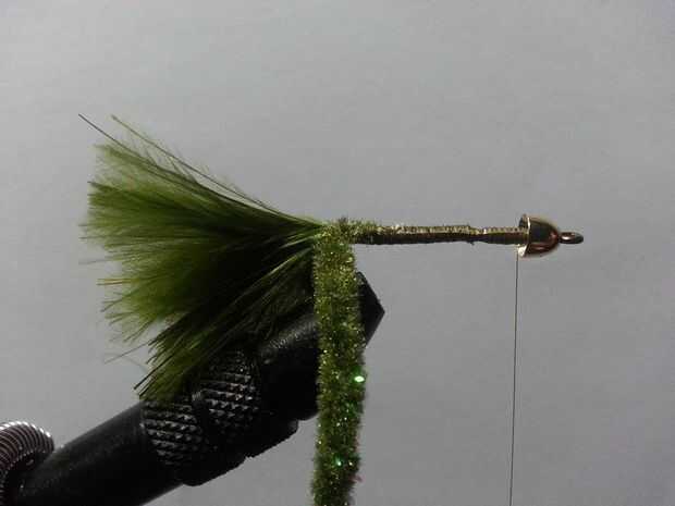 2. Enrolle el hilo hasta el talón y comenzar a enrollar el chenille uniformemente alrededor del gancho.