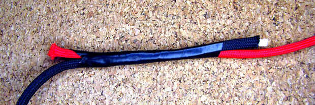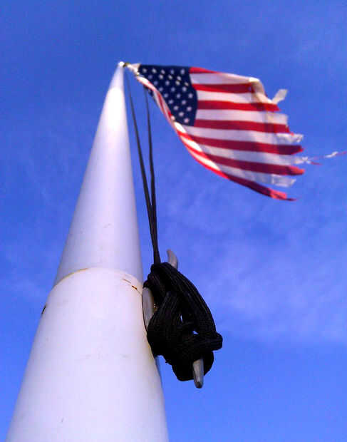 Desatar la cuerda donde está atado juntos. Poner el cable nuevo al lado de la cuerda vieja con sobre una superposición de 6-8", y luego Envuelva la superposición toda bien con cinta aislante. Tirar el otro extremo de la cuerda vieja para levantar suavemente una hasta nueva y sobre la polea. Al llegar a su empalme con cinta abajo otra vez, cinta de las Naciones Unidas, unir los extremos de la cuerda nueva, correr la bandera para arriba y ver si alguien saluda!