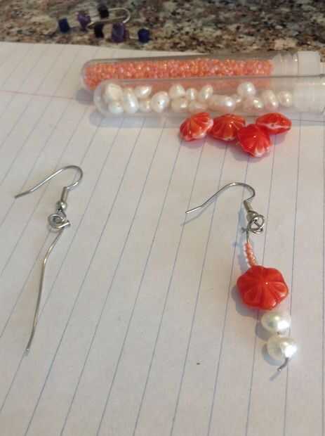 Siguiente me resbala 4 naranja pequeñas perlas en el alambre, luego agregué una flor grande naranja y roja. Y luego 2 perlas (artificiales) a una pendiente. (Puede escoger hasta estos granos y ganchos en su tienda local de Michaels o artes y oficios