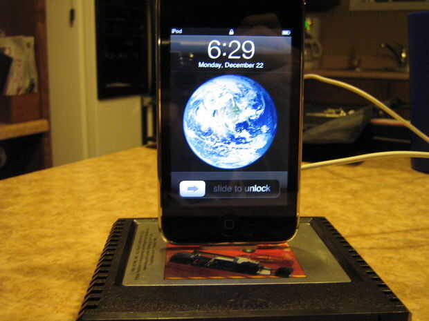 su un muelle en un juguete (un munny, un mono buscando juguete plástico hizo ser costomized, allí $20 en www.kidrobot.com) este "cómo" le ahorrará alrededor de 20 dólares de apple ipod dock y está en un nivel nother entero de fresco.http://forum