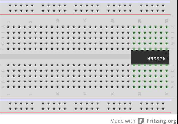 c) Coloque el temporizador 556 en el extremo derecho de tu protoboard, con la muesca de la U a la derecha.