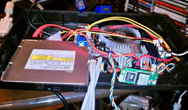 Después de decidir sobre la colocación final, entonces comenzó el proceso de lograr todo en su lugar. Recuerde - tienes sólo 1U de espacio para trabajar con, por lo que necesita mantener todo bajo perfil. En lugar de usar separadores de cobre reales, usé los discos de goma de silicona, ya que son la mitad de la altura. Utiliza mi herramienta rotatoria con una broca para hacer agujeros y todo lo atornilla - la placa base, disco duro (debajo el DVD) y DVD slim drive. Detrás de la unidad de DVD, he añadido un pequeño ventilador procedente de un viejo disipador AthlonXP. El ventilador más pequeño es más que suficiente para mantener el calor del edificio donde se encuentran las unidades. El ventilador sopla hacia fuera, a través de la parte inferior de la caja.