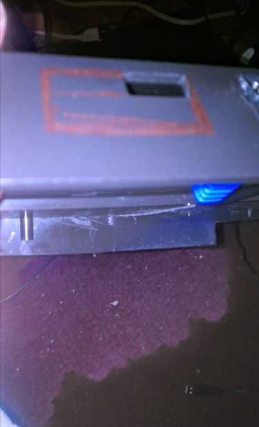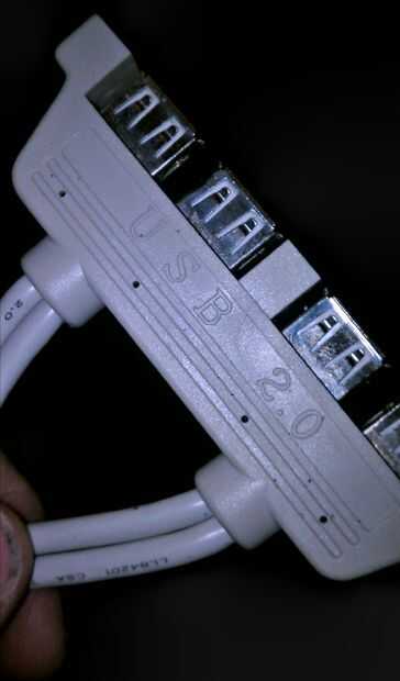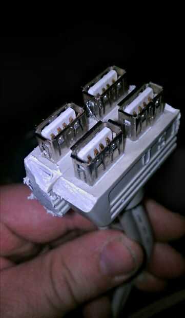 Entonces tomé el soporte USB interno, quitar y desechar la pieza de metal, corte de la carcasa de goma por la mitad y pegan las mitades. Los puertos eran entonces 'prettied para arriba' con más del donante plástico, insertado a través de la cúpula y caliente pegado en lugar.