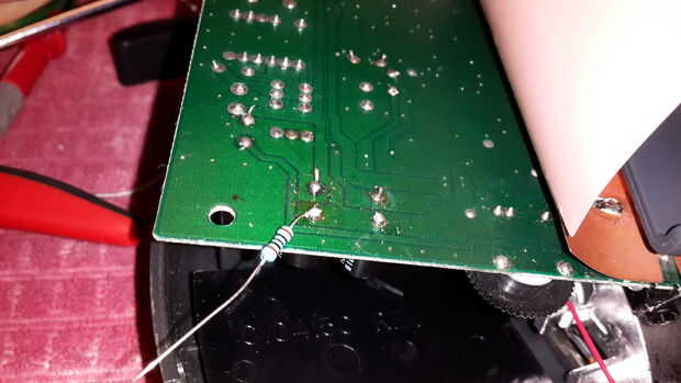 Ahora corta y suelda el resistor de 100 ohm al punto de soldadura masa 5v se muestra a continuación.