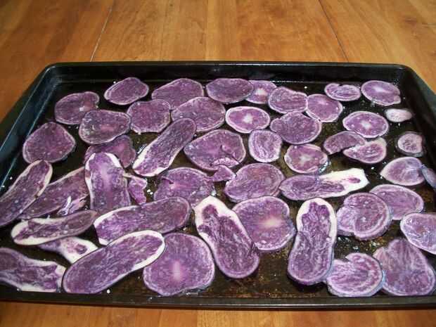 Puesto que ya eres rebanar verduras y poner en el horno, usar una mandolina o procesador de alimentos (o incluso un pelapapas si no tienes los otros) para hacer algunos súper fina en rodajas chips para poner en el plato al lado del sandwich. Aquí he utilizado patatas azul para hacer patatas fritas, pero puede utilizar prácticamente cualquier raíz veggie-remolacha, ñame, zanahorias incluso si usted tiene gusto. Simplemente arreglar las rodajas en una sola capa sobre una bandeja para hornear, salpicar o rociar con un poco de aceite de oliva o de canola, y espolvorear con sal marina y cualquier otros condimentos que te gusta. Poner la bandeja en el horno caliente (475-500 grados F) y deje cocinar hasta que el disco duro en el primer lado. Darles la vuelta y cocinar del otro lado hasta que es curruscante. Cocinan muy rápidamente y puede ir de bien doradas a quemado bastante rápido, por lo que necesita para mantener un ojo sobre ellos. Saben mucho mejores que comprado patatas fritas y son más saludables, ya que ellos no son frito.