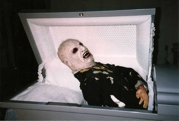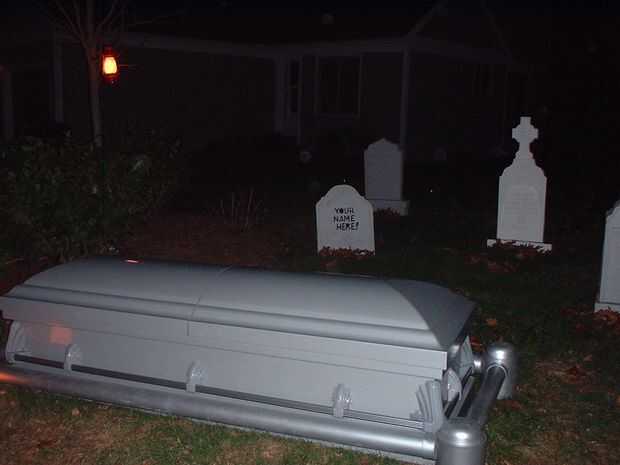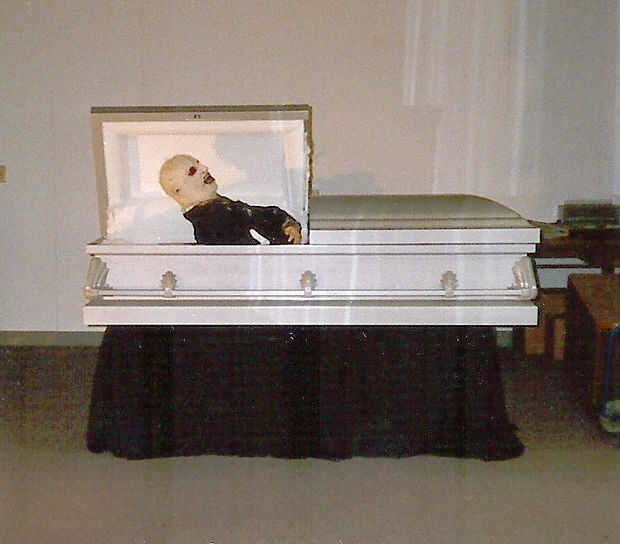 Foto 2. Bob también puede ser ubicado en el patio de la tumba listo para ser internado. Esto puede hacerse proporcionando una reproducción del dispositivo de descenso de la funeraria de drenaje plástico tubo aerosol pintado plata con galón latas de pintura en las esquinas con tazones de cereal invertida, todo pintado plata.