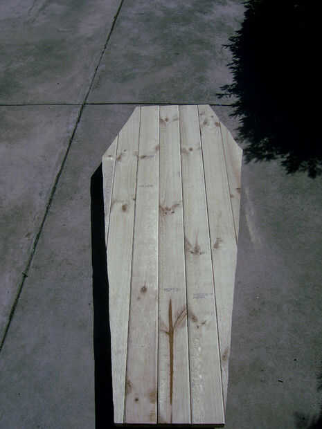 No tengo una foto, pero primero había hecho una plantilla de tamaño completo del ataúd y había establecido a través de siete piezas de madera. La plantilla de entonces fue remontada a la madera, y fue cortado a la medida