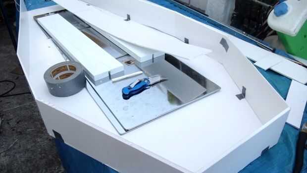 Me puso una franja contra la forma de ataúd de fondo y había marcado donde quería un doble y anotó el "afuera". Luego une el lado con tiras de ducttape y mueve a la siguiente pieza hasta que tenía una caja, entonces corrí hotglue alrededor de las articulaciones