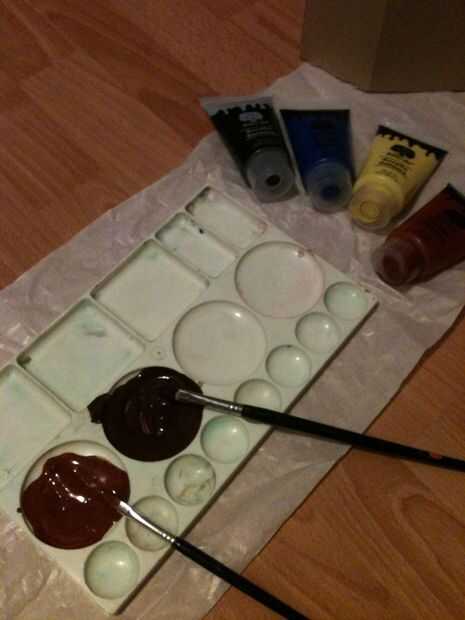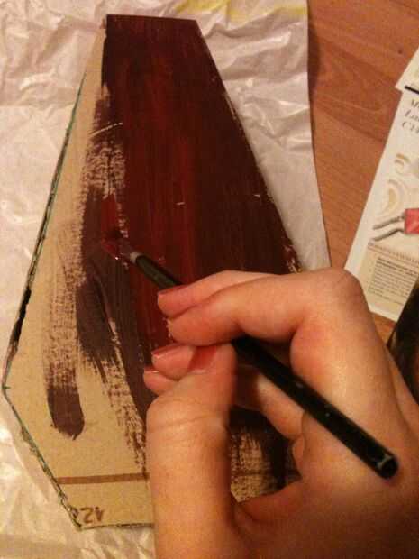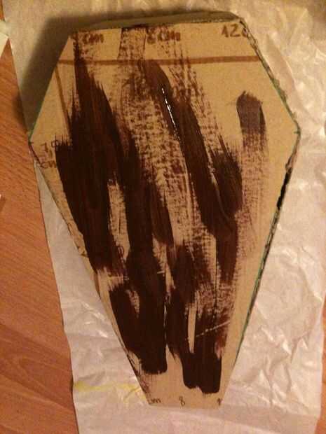 Decidí pintar mi ataúdes marrón con efecto madera. He utilizado dos tonos de marrón que conseguí mezclando pintura roja, azul y amarilla y para obtener un marrón más oscuro acabo de añadir un poco de pintura negra. El efecto madera fue alcanzado por la pintura manchas marrones en mi ataúd y luego pintura arriba y abajo con una pintura marrón clara.