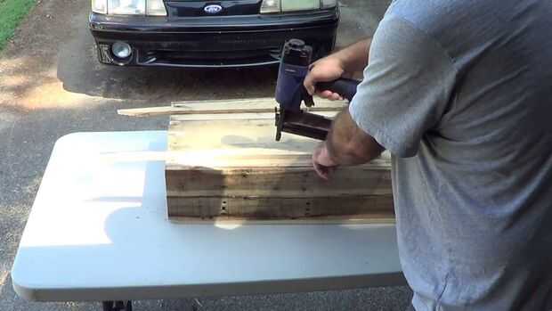 Arrancó un par de trozos de paleta para hacer algunas apuestas que pude poner en el suelo. Que estas en un punto de corte en el extremo. Entonces con grapas a la parte posterior del ataúd.