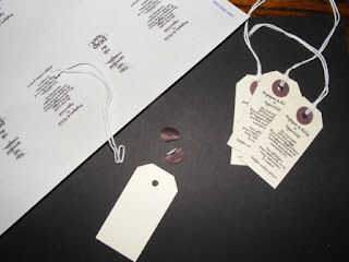 El texto de la invitación fue impreso en etiquetas de equipaje mini. Para colocar el texto en las etiquetas I impreso en etiquetas claras, deconstruye las etiquetas, pega las etiquetas en cada lado de la etiqueta, había les había recortado, repunched los orificios y luego volver a colocar las etiquetas juntos otra vez, pegado en los reforzadores del agujero y los lazos de recauchutado.