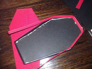Una vez cortado, dobla cada línea en contra de la regla para un pliegue agudo, suave y había pegado a las pestañas. Decidí a cada ataúd en una fabulosa tarjeta roja corrugada que encontré. Cortar longitudes de 8mm de ancho cortadas a la longitud (la circunferencia de la medida interior del ataúd) y pegado en lugar. Luego pegué en el revestimiento interior. Las tapas, en 5mm de profundidad, decidí eran demasiado estrechas para línea.