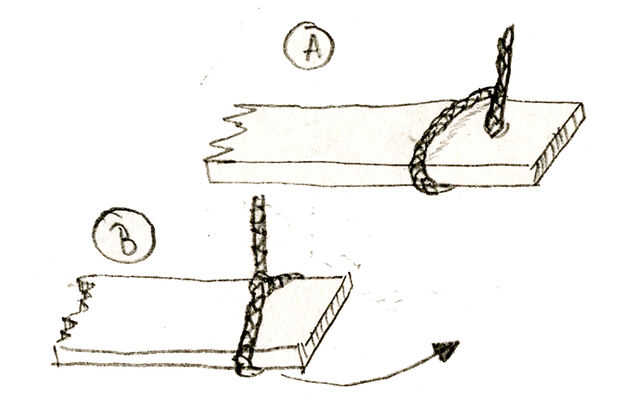 • Curso con opción A significará que usted no volverá su cuerda/cable pero las cuerdas definitivamente no se deslizan fuera de los consejos que le causa un terrible incidente. Simplemente hacer un bucle que se adapta perfectamente sobre cada extremo de los tableros, taladre un orificio en ambos extremos de cada tabla (si fuera a una plaza en el extremo de cada tabla de la imagen, taladre el agujero en el centro de ese cuadrado) y deslice la cuerda a través de la Junta para que bloquea el lazo sobre la tabla.