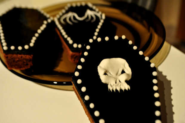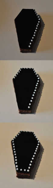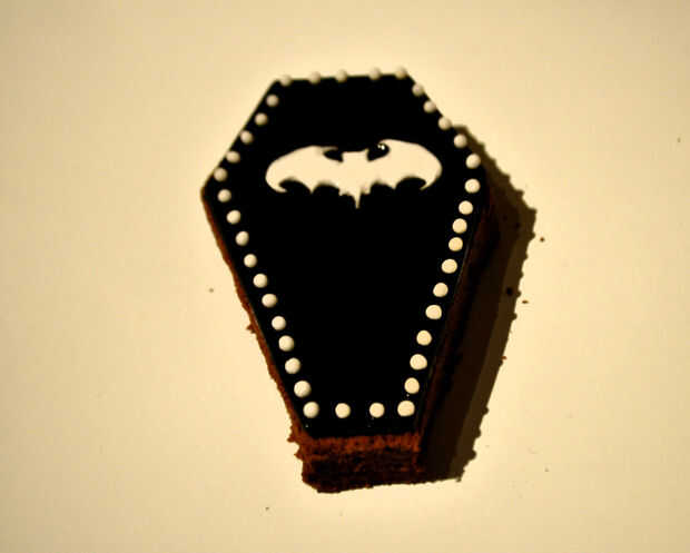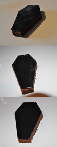 Estirar el fondant negro y colocar las mismas plantillas sobre reducir estas formas de ataúd. Colocar el fondant encima de los ataúdes de chocolate (usar jarabe de fresa o cereza para pegar como se muestra en las imágenes). Difundir el jarabe encima fondant negro para que sea brillante. Se pueden decorar estos pequeños ataúdes con los granos de azúcar blanco (o usted puede hacer de fondant blanco.