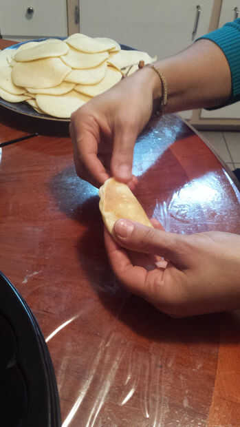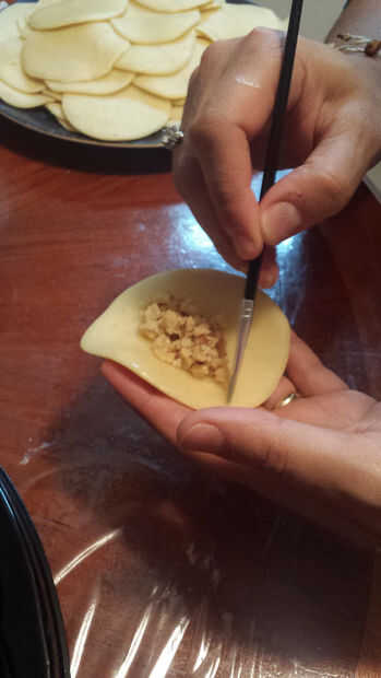 Tomar una tortilla y poner sobre una cucharadita de relleno en el centro, mojar los bordes con agua usando un cepillo pequeño y doblar presionando ligeramente sobre los bordes hasta que los bordes se pegan.