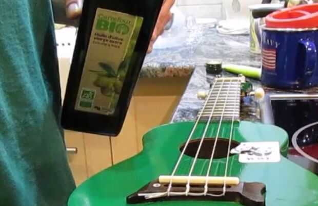 e. Vierta un poco de aceite en el interior el ukelele y moverse el ukelele para que el aceite tenga en todas partes. Este paso aquí no es una cosa estándar para ello, si no confías en mí :) no se en tu ukulele más caro. intentar primero en un ukelele de viajes baratos que usted quiere a prueba de mal tiempo, por ejemplo. Que he estado haciendo durante mucho tiempo y personalmente siento que da mi uke un agradable sonido redondeado a aceitar el interior. Puede comprobar la muestra de sonido después de engrase en el video si quieres.