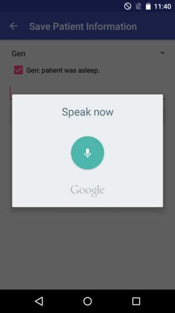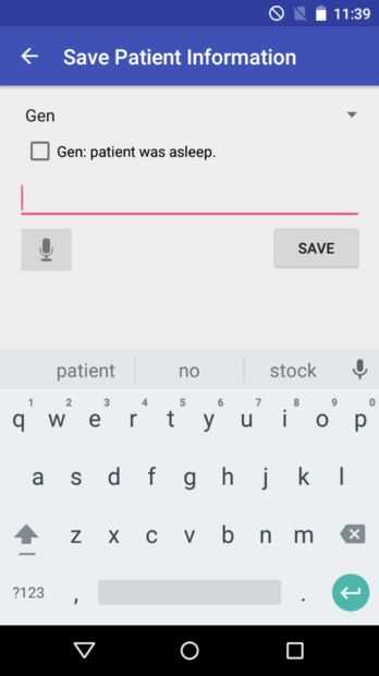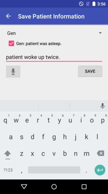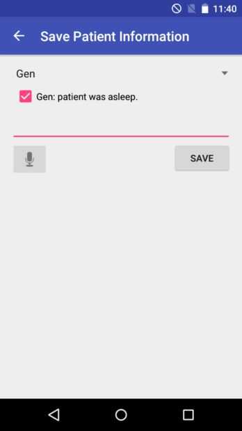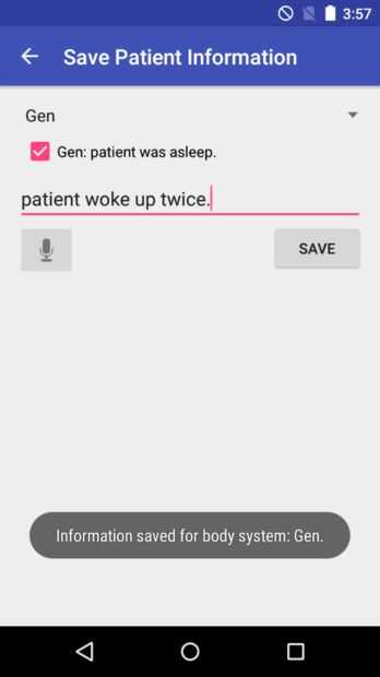Para guardar la información para el paciente, el usuario selecciona el botón de guardar la información en el menú principal. A continuación, el usuario puede elegir un sistema para el que se guardará la información. Después de seleccionar el sistema del cuerpo, la aplicación mostrará las respuestas valores predefinidas por el sistema elegido. El usuario puede elegir entonces uno o múltiples respuestas comunes de la lista. Si quieren información más detallada de la entrada, pueden elegir entrada de voz haciendo clic en el botón de micrófono o escribiendo texto en el campo de texto. Si el usuario elige el reconocimiento de voz, la entrada capturada se mostrará al usuario y tener la oportunidad de editarlo. Después de que el usuario está satisfecho con la entrada, hacen click en guardar y se guardará la información en la base de datos. Si la información se ha guardado con éxito, el sistema notificará al usuario. El usuario sólo podrá agregar información sobre un sistema en un momento. Si ninguna entrada es proporcionada por el usuario, pero se hace clic en guardar el sistema le informará al usuario para introducir información sobre el paciente.
