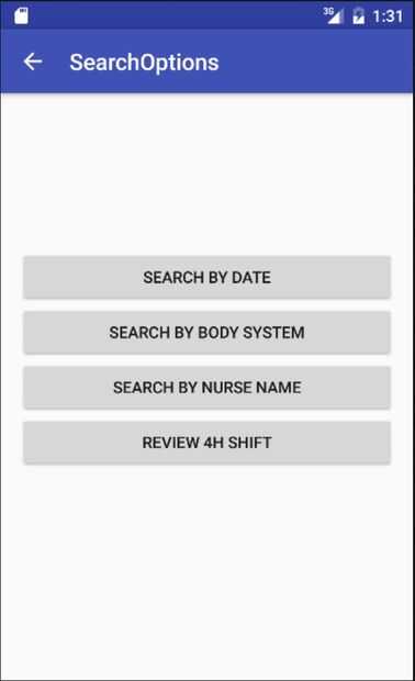 presentó con cuatro opciones. Para revisar la información para el paciente, existen las siguientes opciones: el usuario puede buscar por fecha, por organismo o por nombre de la enfermera. El usuario también puede pulsar un botón para revisar las últimas cuatro horas.