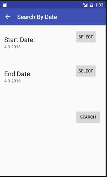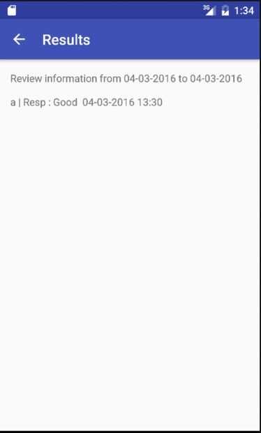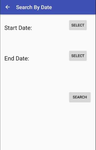 Para encontrar información para el paciente para un bloque de tiempo específico, el usuario selecciona la búsqueda por fecha en el menú. Luego el usuario selecciona una fecha de inicio y final del calendario haciendo clic en seleccionar y haga clic en buscar. La siguiente pantalla muestra los resultados para el bloque de tiempo especificado. En caso el tiempo que el bloque no es válido, un pop up notificará al usuario.