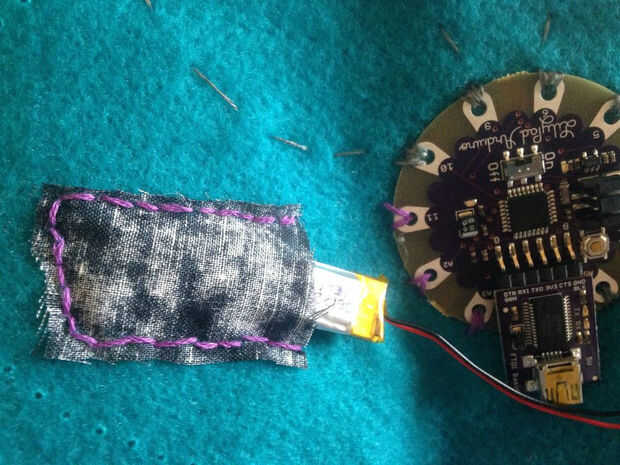 Para mantener la batería con seguridad escondida en el proyecto terminado, cosí un trozo de tela en el vientre del búho para hacer un bolsillo pequeño. Usé la puntada corriente doble para sujetar a la tela al cuerpo de fieltro.