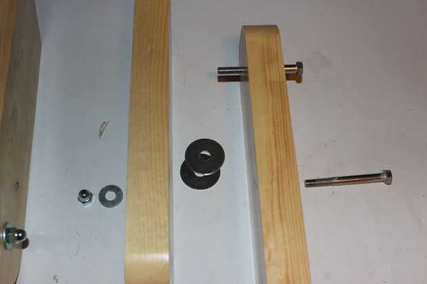 Para poner el perno por el exterior, 2 arandelas de defensa siguiente, la pierna, otra arandela guardabarros o pequeño arandela y la tuerca. Ver fotos. Usé 2 patas para los cuadros de referencia para mostrar cómo van juntos y también para asegurarse de que tenía el espesor correcto.