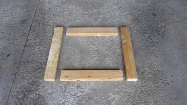 Para los lados derecho e izquierdos, cortar secciones de 2 x 4 que fueron 24 pulgadas de largo. Por los lados anterior y posterior, corté trozos fueron 20.5 pulgadas. Las dimensiones reales de un 2 x 4 son 1.5 x 3.5. Así que esto haría que un marco que fue 24 x 23,5 pulgadas.