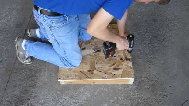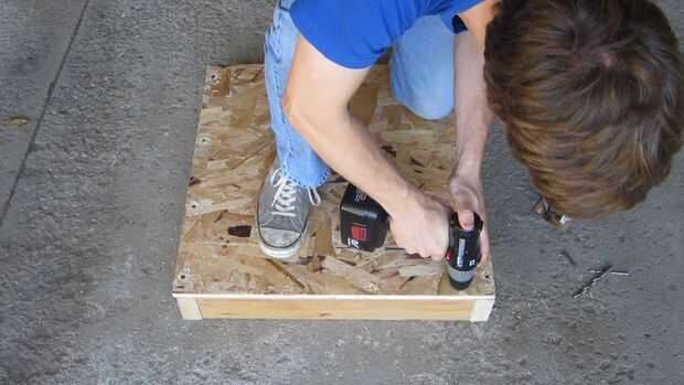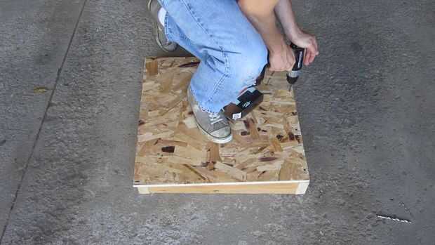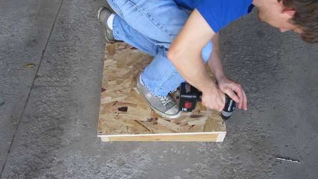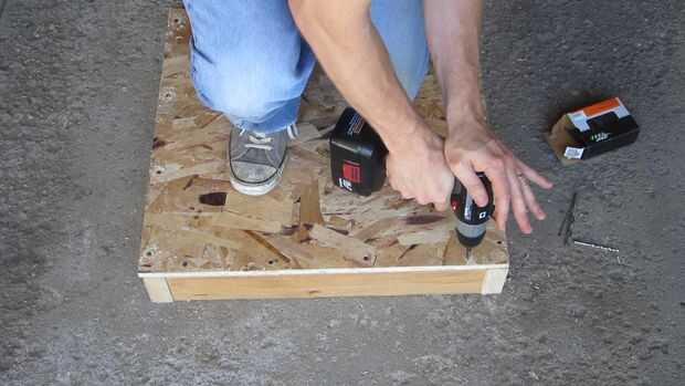 Una vez que esté montado el marco de 2 x 4, está listo para fijar el tablero de OSB en la parte superior. Alinee el tablero de OSB en el marco de 2 x 4. Si los lados del marco no son perfectamente cuadrados, apenas se centran en la guarnición a un lado. Luego presione el tablero superior en su lugar. Me quedé solo en la parte superior.