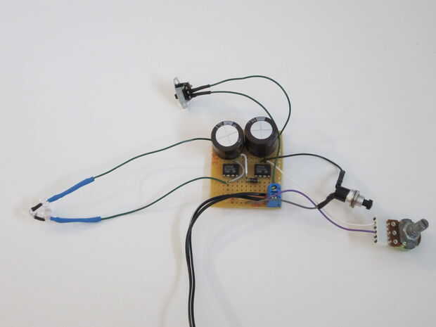 Entonces si funciona el prototipo protoboard, lo soldadura en una placa de circuito. Estoy usando un estilo que se presenta como una placa de circuitos impresos. Para no tener que cambiar mucho mi diseño. Con el fin de ahorrar espacio estoy apilando algunos componentes. Por lo que es importante asegurarse de que no haya cortocircuitos. Para conectar la resistencia variable, estoy usando una tira de los cables de puente de PC con algunos de los cables cortados. Para mi fuente de luz estoy usando tres LEDs en serie cuyas tensiones combinadas es cerca de la tensión de alimentación por lo que estoy renunciando agregando un resistor. Tiendo a utilizar un lote de tubería encogible para aislar mis conexiones de soldadura. Me parece que ayuda a evitar cortocircuitos indeseados.