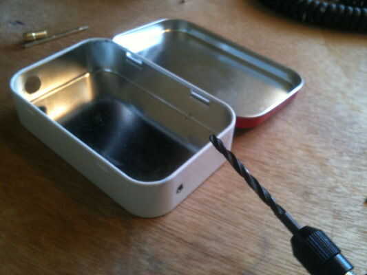 Necesitará perforar la lata para los enchufes. La lata Altoids curiosamente fuerte, terminé agrandando el agujero llenando lejos. Se llevó para siempre. Usted también tendrá que hacer espacio para cerrar la tapa, pero esto es más fácil hacer una vez que tengas los conectores.