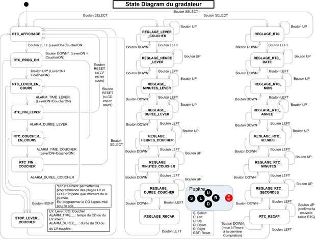 Para organizar las varias tareas y mostrar mensaje he utilizado una máquina de estados finitos (véase el diagrama de estado... en francés).