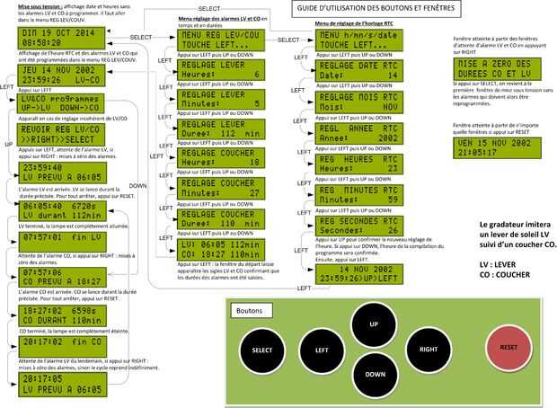 Este aviso permet de programmer le gradateur en LV et CO, de ajustar l ' Horloge RTC et de visualiser les différents écrans affichés.