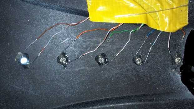 Tira de los cables y soldar cada par a un LED. Por ejemplo, la soldadura el marrón sólido al ánodo del LED más lejano a un lado y el cable marrón/blanco a ese cátodo del mismo LED. Luego usar naranja el LED siguiente, verde para el próximo y azul para la próxima. Esto no está establecido en piedra, pero sólo hace más fácil seguir cuando usted está conectando los otros extremos de los cables. Repita para los LEDs en el otro lado. ¿Tienes dos LEDs inconexos a la izquierda, derecha? Los dos a cada lado del agujero del centro. Utilice el tercer trozo de CAT5 para conectar los LEDS restantes (elija cualquier pares del color que más te guste).