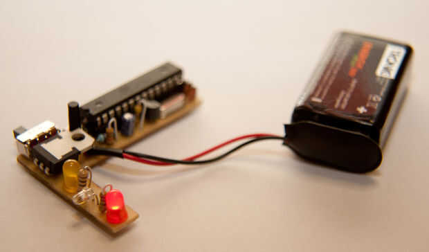Cuando todo es soldado en su lugar empuje la IC en su zócalo (que ya había programado en Arduino), conectar la batería y encienda el circuito. Debe encender el LED de encendido (rojo), y después de 3 segundos el LED (amarillo) Estado deberá parpadear algunas veces (depende de la clavija de la región). Entonces usted puede presionar el botón para hacer el circuito binning para transmitir. Compra LED parpadea cada vez que se envía un código diferente.