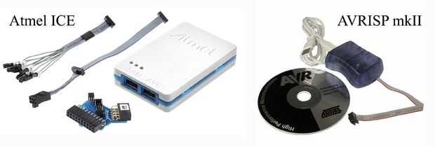 Figura 3: HIELO de Atmel (izquierda) y AVRISP mkII programadores (derecha). La versión básica de hielo incluye el cable USB y el cable de 2 º de la parte superior izquierda.