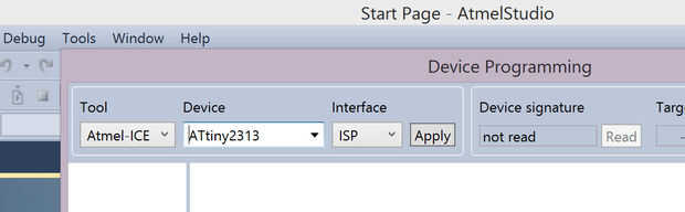 Seleccione el menú 'Herramientas' y luego 'Dispositivo de programación'. Seleccione el cuadro desplegable de 'Herramienta' y asegúrese de que aparezca la opción 'Atmel ICE'. Seleccione la interfaz de ISP y programador de hielo. Proceder al paso siguiente sin cerrar el cuadro de diálogo dispositivo de programación.