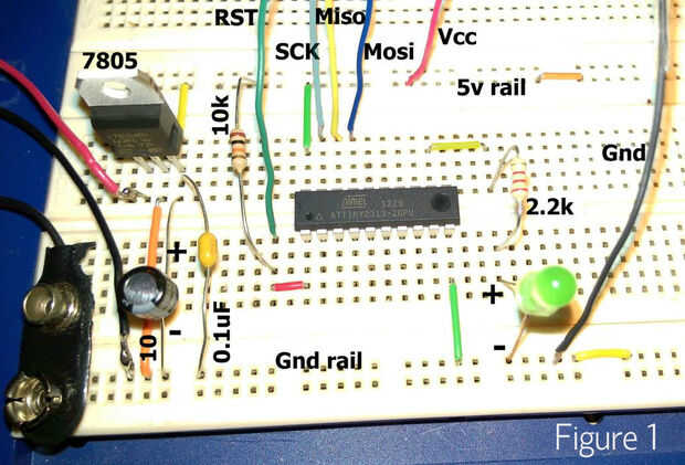 Empezamos por construir un circuito en protoboard de un experimentador que se utilizará para fijar los fusibles, así como una plataforma experimental para los siguientes dos artículos de la serie de arranque. El circuito incluye un regulador de 5 voltios para el MCU, el cable adaptador del programador construido en arranque #1 y añade un LED para Blinky y la cuerda de salvamento (pero no utilizado en el presente Instructivo). El Instructable presente también mostrará cómo agregar un cristal en el circuito MCU ya debatiremos relojes y los fusibles.