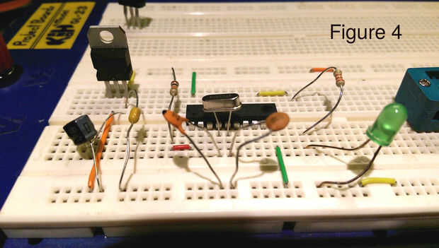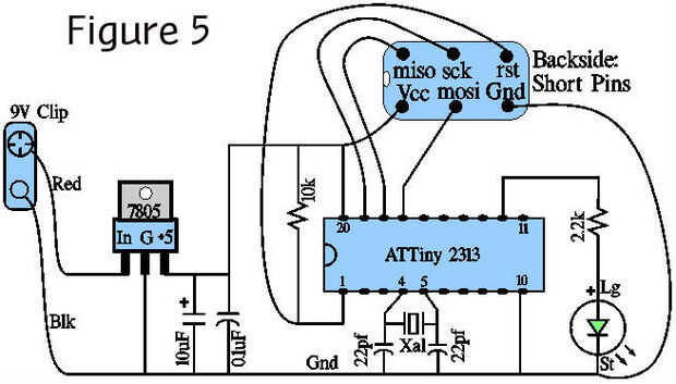 Si lo desea, el cristal puede conectarse a los pines 4 y 5 junto con condensadores de 22pf como se muestra en las figuras 4 y 5. PF se refiere aquí a los picofaradios. El cristal puede oscilar por debajo de 1 MHz hasta 20 MHz para el Atmel AVR. Como se mencionó anteriormente, la tarifa de reloj máxima que puede ser utilizada por el MCU depende del voltaje aplicado a la MCU. No es necesario instalar el cristal y los condensadores cuando el MCU está en el oscilador interno.