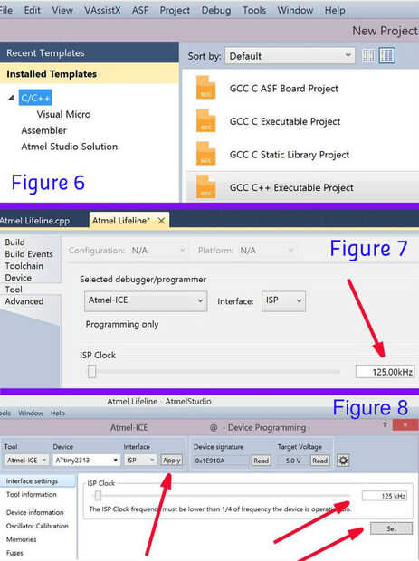 Figura 6: En ' archivos > nuevo proyecto ' Seleccione proyecto de ejecutable de C++ de GCC. Figura 7: En ' proyecto > Propiedades de la cuerda de salvamento Atmel establece el programador y el reloj de la ISP. Figura 8: En ' Herramientas > Programación del dispositivo ' configurar el programador, leer la firma de dispositivo y ajustar el reloj de la ISP.