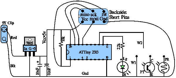 Resumimos los puntos relevantes de Blinky uno en la puesta en marcha 2: tenga cuidado de que el terminal positivo de la batería de 9v se conecta el regulador de entrada y no el riel de 5v en la parte superior de la placa. Tenga en cuenta: no revertir el sesgo el MCU (o bien kaput), no revertir el sesgo el condensador (o bien apestoso kaput), no revertir el sesgo el LED (o quizás nada). Los condensadores y las resistencias tienen el valor impreso en el lado o bien tienen y como se muestra en las referencias [17,18]. El LED [0.C], elegir rojo o verde para el uso con la 2.2 resistencia k se muestra en el esquema. Azul va a estar bien, pero quizá quieras cambiar el resistor a 1.5k para hacerlo más brillante. Como un punto vale la pena recordar, conecte ningún dispositivo de potencia 5v a una MCU funcionando con menos de 5v desde generalmente un más de un voltaje de 0, 5V - 0.7V basta fumar el MCU.