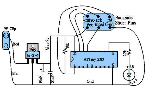 Asegúrese de que ha conectado el circuito de protoboard como se muestra en la figura 8. Tenga cuidado de que el terminal positivo de la batería de 9v se conecta el regulador de entrada y no el riel de 5v en la parte superior de la placa. Tenga en cuenta: no revertir el sesgo el MCU (o bien kaput), no revertir el sesgo el condensador (o bien apestoso kaput), no revertir el sesgo el LED (o quizás nada). Los condensadores y las resistencias tienen el valor impreso en el lado o bien tienen y como se muestra en las referencias [5,6]. Para el LED, elija rojo o verde para el uso con la 2.2 resistencia k se muestra en el esquema. Azul va a estar bien, pero quizá quieras cambiar el resistor a 1.5k para hacerlo más brillante.