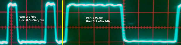 Figura 9: Fotos de una pantalla de osciloscopio. Izquierda: Una forma de onda asimétrica del Pin 12 cuando se utiliza sola PORTB = 0 x 01 Declaración del programa Lifeline. Derecha: Una onda simétrica utilizando los tres PORTB = 0 x 01 declaraciones. Las escalas horizontales difieren entre la izquierda y la derecha por un factor de cinco; sin embargo, Pin 12 pasa la misma longitud de tiempo en el estado cero para la izquierda y la derecha.