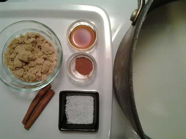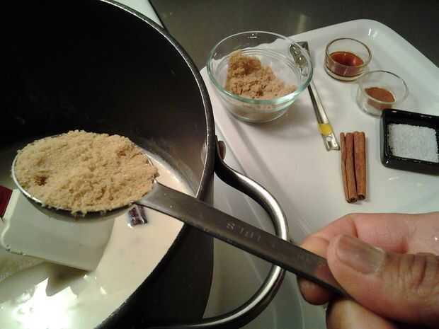 -mientras se está calentando la leche, añadir el azúcar, canela, extracto de vainilla y sal