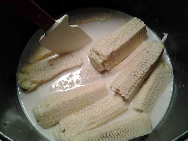 -cortar el maíz mazorcas por la mitad y ponerlos en la olla con la mezcla de leche hirviendo