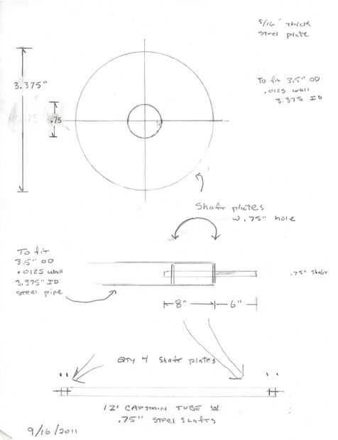 La principal preocupación era que el eje 1" sería fiel a la tubería de 3.5". Dos placas idénticas caben dentro de la tubería de 3.5". Tenga en cuenta que el tubo tiene una costura, y así tierra la placa acabada en un punto. En la versión final dejamos unos 12" dentro de la tubería con 6" que se extiende para los rodamientos y unidades.