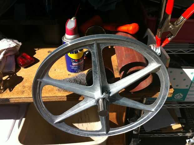 14" con 1" polea de ID en el eje.  Dado polea de fundición, cinturones tamaño A grove solo.